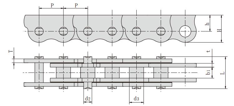 鏈號(hào) 節(jié)距 內(nèi)節(jié)內(nèi)寬 銷軸直徑 銷軸長(zhǎng)度 鏈板尺寸 抗拉強(qiáng)度