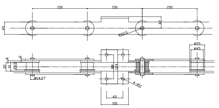 輸送鏈條,節(jié)距為150mm,帶托板附件,滾軸為F輪,應用于多種輸送設備上,上圖主要為輪轂輸送線