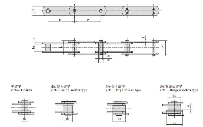 鏈號(hào) 節(jié)距 滾子尺寸 銷軸直徑 銷軸長(zhǎng)度 鏈板高度 鏈板厚度 抗拉強(qiáng)度 每米長(zhǎng)重