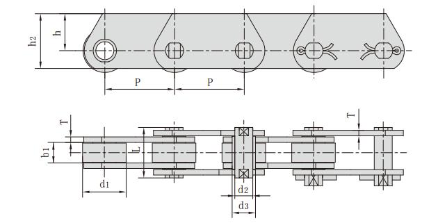 鏈號 節(jié)距 滾子直徑 銷軸直徑 套筒直徑 鏈板厚度 內(nèi)節(jié)內(nèi)寬 銷軸長度 鏈板高度 抗拉強(qiáng)度