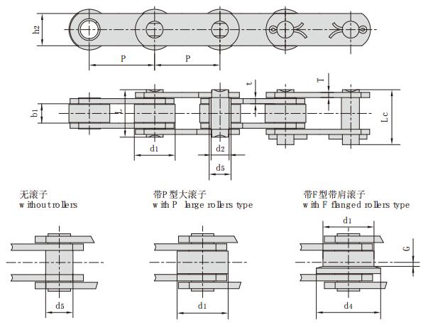 鏈號 節(jié)距 滾子尺寸 套筒直徑 內(nèi)節(jié)內(nèi)寬 銷軸直徑 鏈板高度 銷軸長度 鏈板厚度 抗拉強度