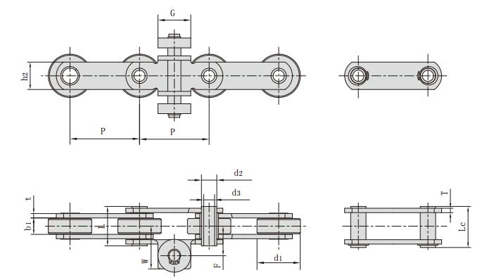鏈號(hào) 節(jié)距 滾子直徑 內(nèi)節(jié)內(nèi)寬 銷軸直徑 銷軸長(zhǎng)度 內(nèi)鏈板高度 鏈板厚度 附件尺寸 抗拉強(qiáng)度 每米長(zhǎng)重
