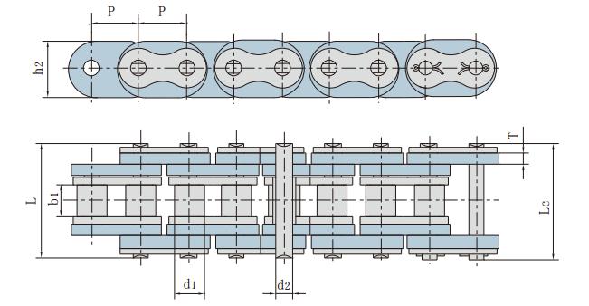鏈號 節(jié)距 滾子直徑 內(nèi)節(jié)內(nèi)寬 銷軸直徑 銷軸長度 附板、鏈板尺寸 抗拉強(qiáng)度 每米長重