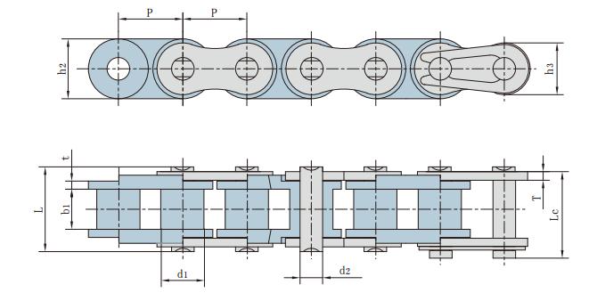 鏈號 節(jié)距 滾子直徑 內(nèi)節(jié)內(nèi)寬 銷軸直徑 銷軸長度 鏈板高度 鏈板厚度 抗拉強(qiáng)度