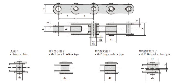 鏈號 節(jié)距 滾子尺寸 內(nèi)節(jié)內(nèi)寬 銷軸直徑 套筒直徑 銷軸長度 鏈板厚度 鏈板高度 抗拉強(qiáng)度